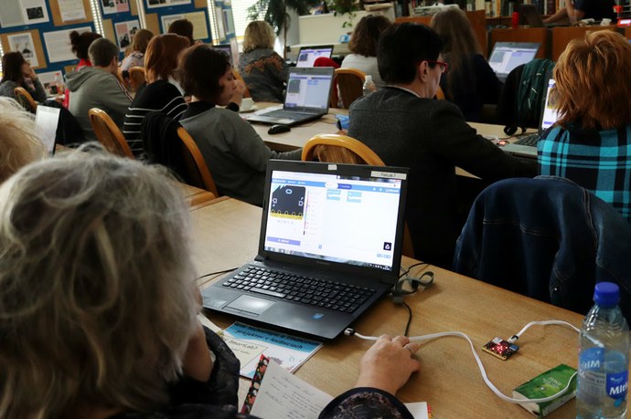 Potešil nás záujem slovenských knihovníkov o workshop Nové technológie a financovanie projektov v knižniciach (18. 10. 2019), ktorý zorganizovala Krajská knižnica Ľudovíta Štúra vo Zvolene. Knihovníci si počas prvej časti 3hodinového workshopu prakticky vyskúšali 3D modelovanie, videli tlačiť 3D tlačiareň, diskutovali aj o najčastejších chybách, prečo by sa nemusela podariť 3D tlač. V druhej časti si vyskúšali programovanie s microbitom na 15 Micro:bit-och, ktoré so sebou nosíme. Na programovanie mikropočítačovej dosky Micro:bit sme použili bezplatné online grafické prostredie MakeCode, v ktorom vytvárali pomocou spájania blokov funkčné programy. Prostredie MakeCode na programovanie pomocou grafických blokov je vhodné najmä pre začiatočníkov – aby sa nebáli programovania. Výhodou tohto prostredia je nízka technická náročnosť prípravy, nakoľko prostredie je online a nie je potrebná žiadna inštalácia. Po vytvorení programu v prostredí si každý knihovník stiahol svoj vlastný program ako obyčajný súbor na dosku veľkosti ako polovica kreditnej karty. Každému sme ukázali, ako súbor stiahnuť v rozličných internetových prehliadačoch. Micro:bit sme mali pripojený k počítaču pomocou kábla USB a na počítači sa zobrazilo ako klasické USB úložisko, na ktoré stiahnutý súbor s programom stačilo skopírovať. Program sa následne automaticky spustil na ich Micro:bit-e.