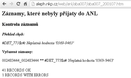 - Na základě kontrol v etapách 3–5 dostane knihovna, která záznamy zaslala, online protokol obsahující výsledek kontroly. Pokud některé záznamy nebyly přijaty do ANL, je v protokolu uvedeno, z jakého důvodu (viz obrázek 1). Záznamy, které nebyly přijaty, musí zpracovatelská knihovna opravit a znovu do ANL.